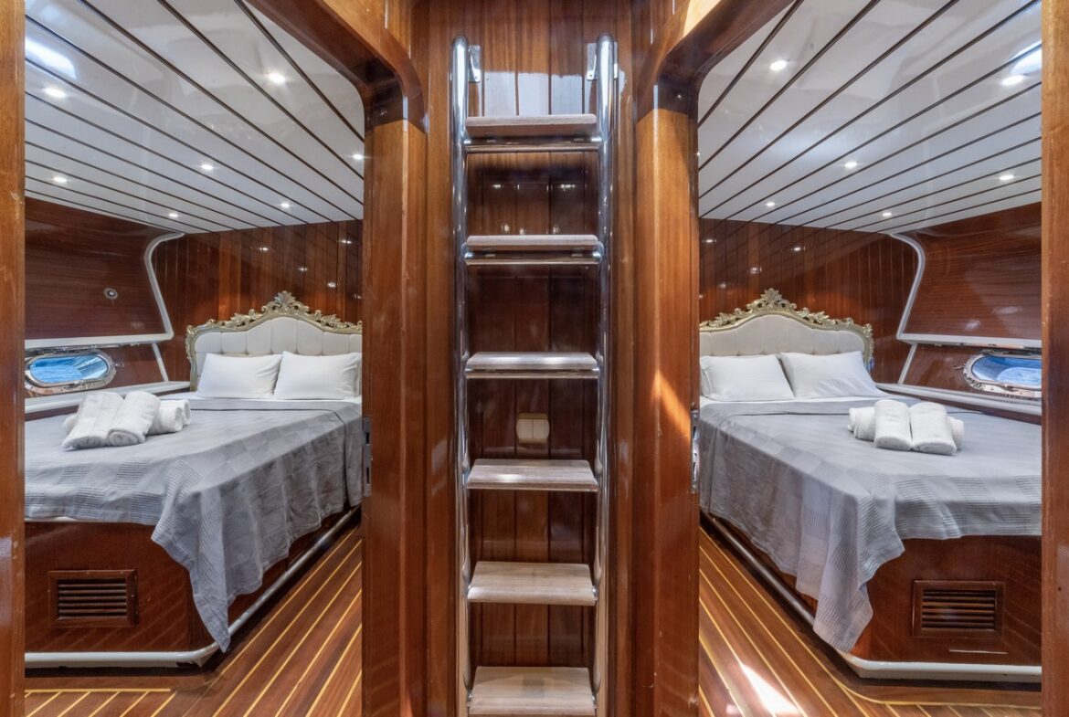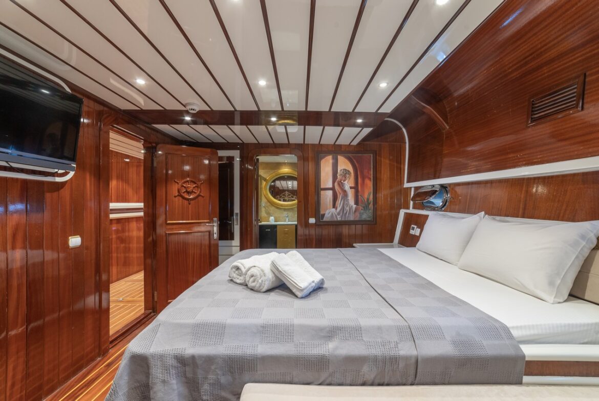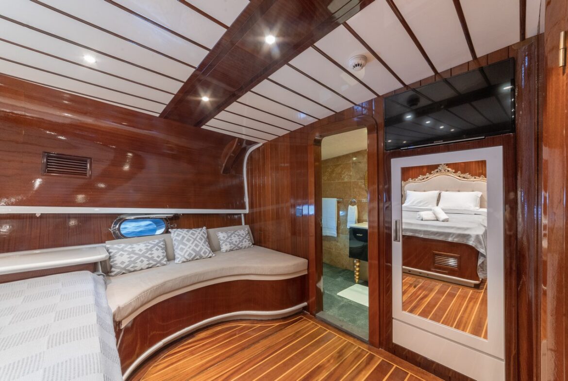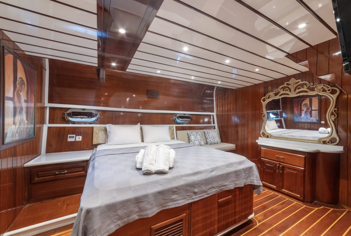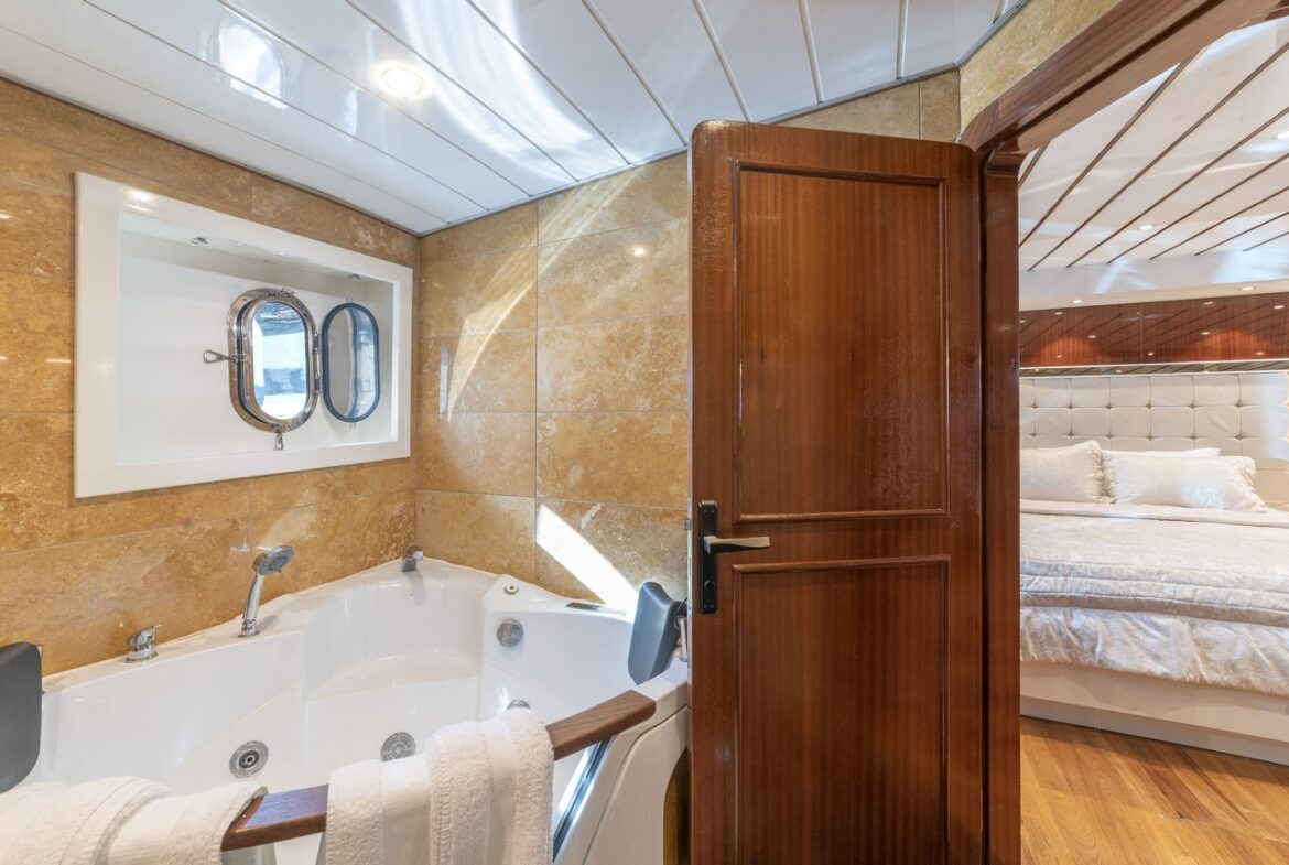 Every detail has been carefully considered in the cabins of the Esma Sultan Gulet Yacht. It features 1 master cabin, 4 VIP double cabins, and 2 twin cabins, prioritizing the comfort of the guests. Additionally, you can indulge in luxury with the jacuzzi in the master cabin. The fly bridge upper deck of the boat is equipped with features that further enhance your comfort. The presence of 2 jacuzzis on the deck is also one of the remarkable privileges.