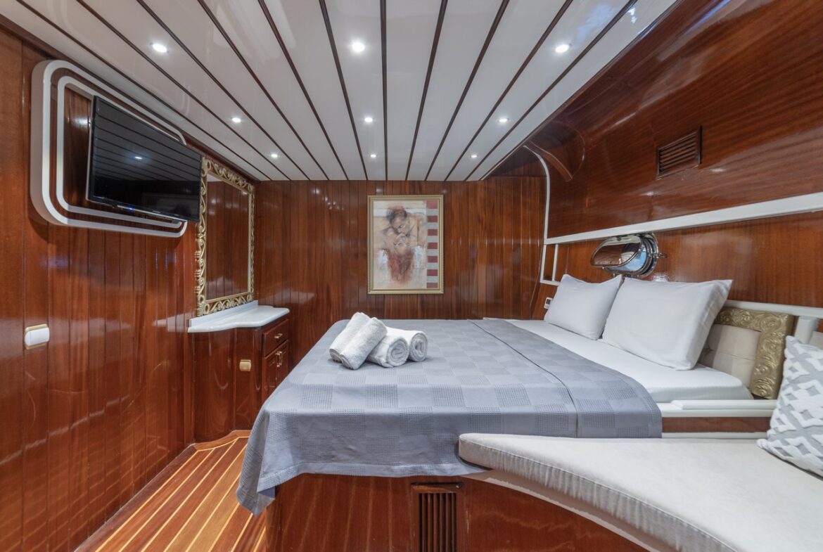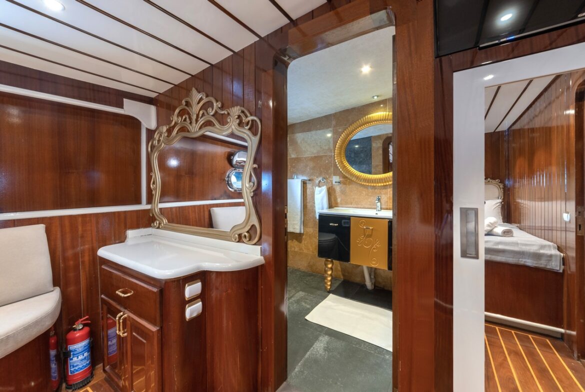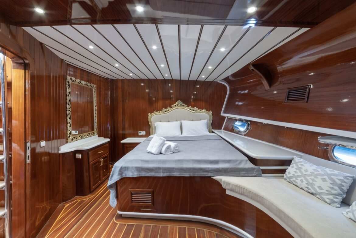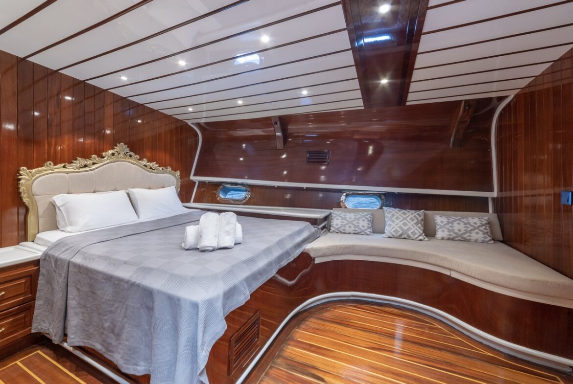 Every detail has been carefully considered in the cabins of the Esma Sultan Gulet Yacht. It features 1 master cabin, 4 VIP double cabins, and 2 twin cabins, prioritizing the comfort of the guests. Additionally, you can indulge in luxury with the jacuzzi in the master cabin. The fly bridge upper deck of the boat is equipped with features that further enhance your comfort. The presence of 2 jacuzzis on the deck is also one of the remarkable privileges.