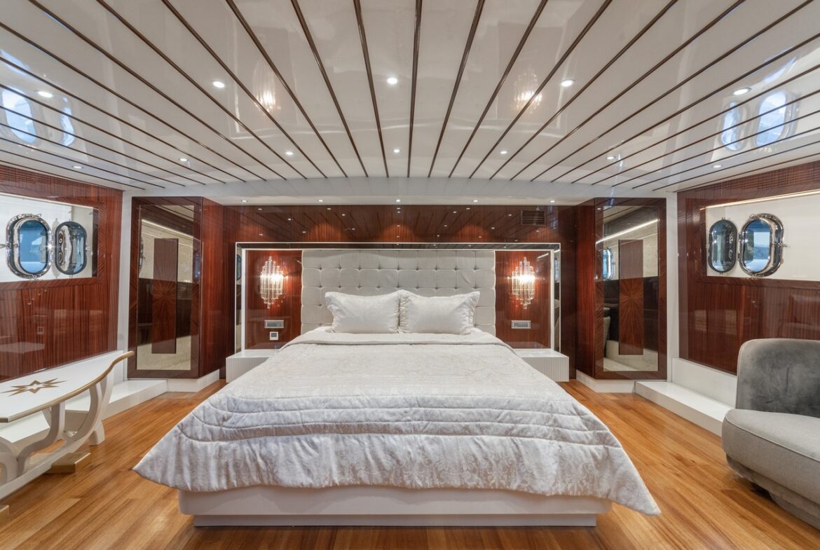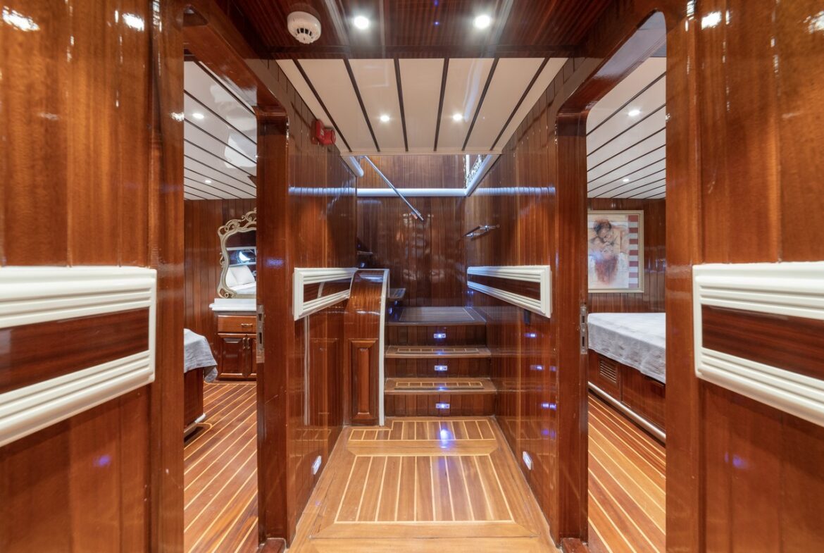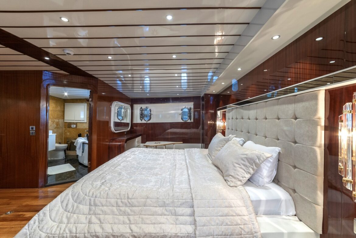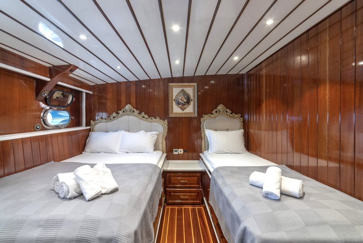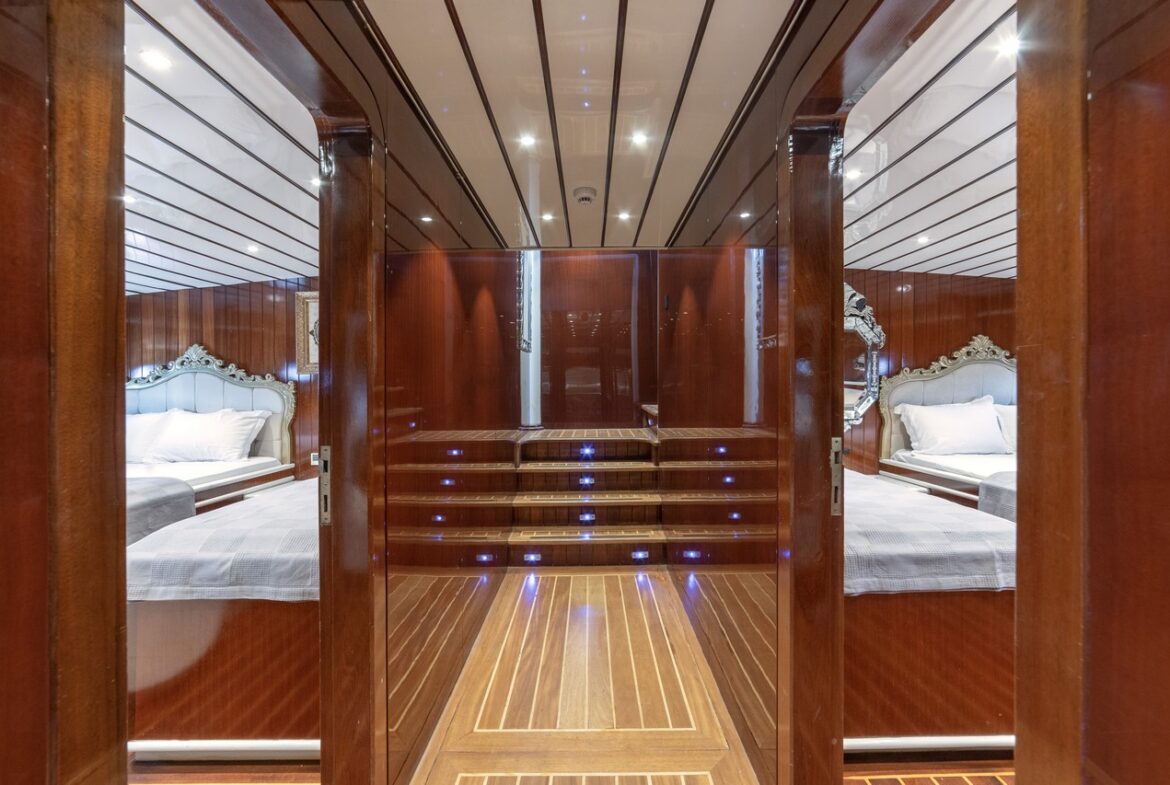 Every detail has been carefully considered in the cabins of the Esma Sultan Gulet Yacht. It features 1 master cabin, 4 VIP double cabins, and 2 twin cabins, prioritizing the comfort of the guests. Additionally, you can indulge in luxury with the jacuzzi in the master cabin. The fly bridge upper deck of the boat is equipped with features that further enhance your comfort. The presence of 2 jacuzzis on the deck is also one of the remarkable privileges.